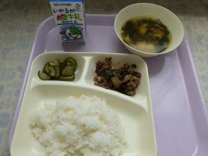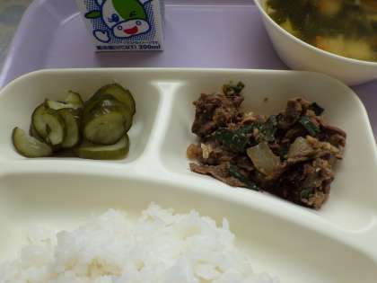 5月17日(火)の給食はプルコギ、とうふとわかめのスープ、きゅうりの甘酢漬け、ごはん、牛乳です。プルコギは牛肉、たまねぎ、にら、しょうが、にんにくが入っています。とうふとわかめのスープは焼き豚、とうふ、にんじん、ブラックマッペもやし、えのきたけ、わかめが入っています。きゅうりの甘酢漬けはあっさりした味付けです。おいしかったです。ごちそうさまでした。