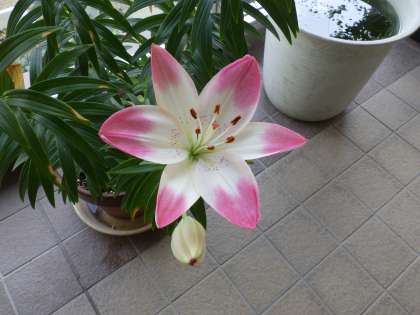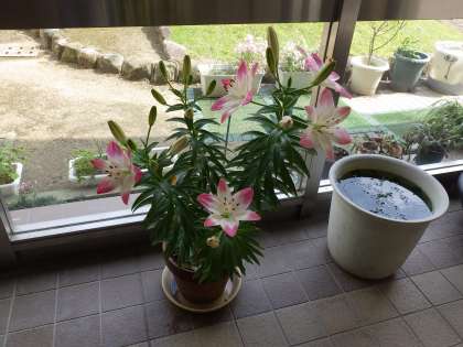 5月27日(金)さわやかな風の中、学校の玄関に管理作業員さんが育てたゆりがきれいな花を咲かせています。