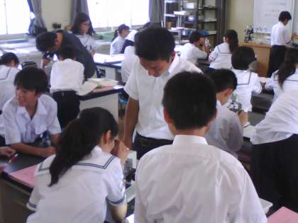 本校では、教科によっては、学力向上サポーターが教科の授業に入り込み、生徒の学習支援をおこなっています。右の写真は、理科実験での学習支援のようすです。