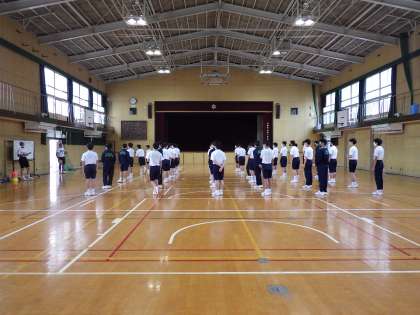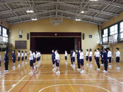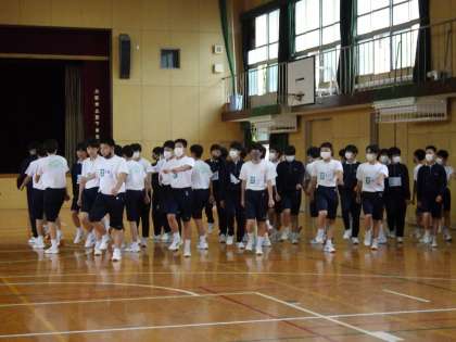 6月6日(月)9日の体育大会に向けて3年生の学年練習、男子の集団行動の様子です。子どもたちの頑張ってる声が響いています。
