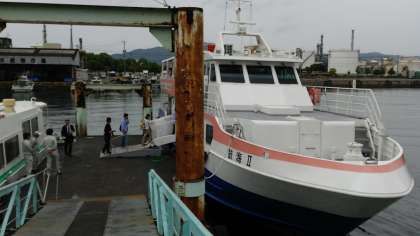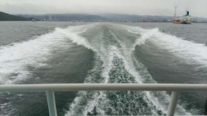徳山港を高速船で出発し、大津島へ航行中です。曇り空ではあるものの、先ほどまで降っていた雨はやみました。