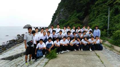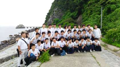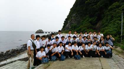 12時55分、大津島(おおづしま)の馬島港に到着。小雨が降ってきました。まずは、瀬戸内海をバックに各クラスで記念写真を撮りました。