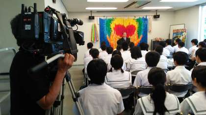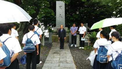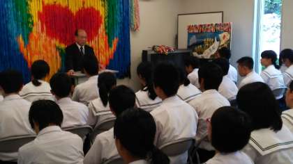 今回の修学旅行の目的のひとつに平和学習があります。これは命の学習とともに、1年生の時から取り組んできたものです。大津島の回天記念館では、世界の恒久の平和を願う平和セレモニーを実施しました。平和を願って黙祷するとともに、平和を願う絵画と千羽鶴を記念館の館長さんにお渡ししました。その後、平和に関する講話を聞いたり、記念館内を巡っての平和学習をしました。