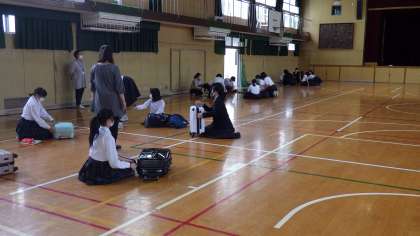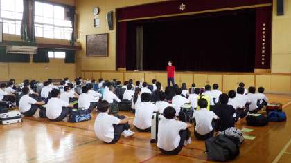 6月14日(火)3年生は明日から修学旅行です。体育館で修学旅行に向けての事前指導です。