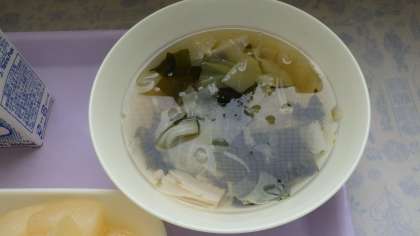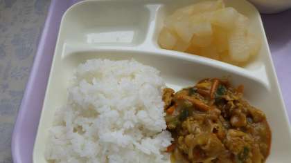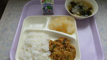 6月14日(火)の給食は和風カレー丼、すまし汁、和なし、牛乳です。和風カレー丼は豚肉、うすあげ、にんじん、青ネギ、ショウガがが入りだしを使った和風味です。すまし汁はキャベツ、えのきたけ、わかめが入っています。おいしかったです。ごちそうさまでした。