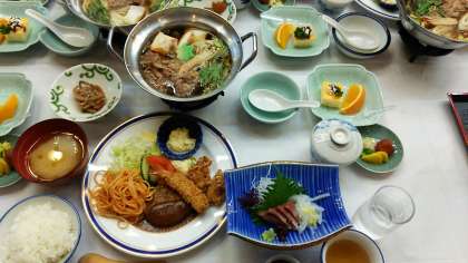 お楽しみの夕食の時間です。食べきられないくらいの食事に、みんなびっくりしていました。