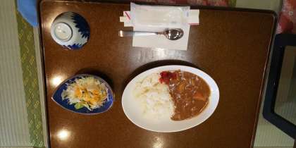 6月16日(木)吉野亭に着きました。昼食です。気温は25℃。天気は晴れ。ラフティング日和です。