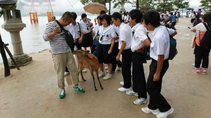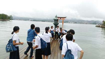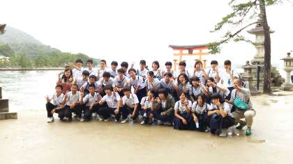 宮島に到着。大鳥居前でクラス写真の記念撮影をしました。その後は、班別行動で散策をしました。