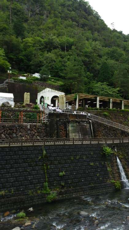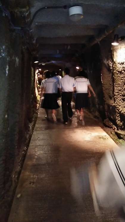 美川ムーバレーは、過去にタングステン鉱石を採掘していたところです。現在は、休坑とのこと。いざ、出発!写真左の中央部の白い建物が入口です。写真右は坑内を進んでいるところです。