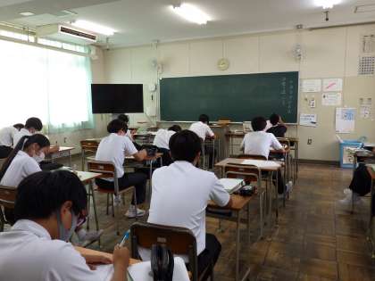 6月27日(月)蒸し暑い一日です。テスト前、子どもたちは頑張っています。3年生の社会と国語の様子です。