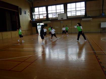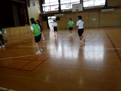 6月27日(月)蒸し暑い一日です。テスト前、子どもたちは頑張っています。2年生の女子の体育、フライングディスクを使っています。楽しそうに参加しています。