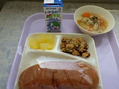 6月27日(月)の給食はカレードリア、豚肉とキャベツのスープ、リンゴ(カット缶)、パン、牛乳です。カレードリアは鶏肉、白米、たまねぎ、グリンピース、が入っています。豚肉とキャベツのスープは豚肉、じゃがいも、ニンジン、パセリが入っています。おいしかったです。ごちそうさまでした。