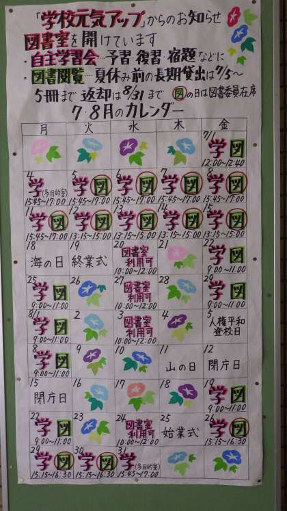 7月4日(月)学校元気アップ 7・8月のカレンダーが玄関掲示板に貼りだされています。