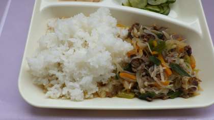 7月13日(水)の給食は牛丼、きゅうりのショウガ漬け、大福豆の煮もの、牛乳です。牛丼は牛肉、糸こんにゃく、たまねぎ、にんじん、青ネギ、えのきたけが入っています。牛丼は牛肉、たまねぎ、にんじん、エノキが入っています。おいしかったです。ごちそうさまでした。