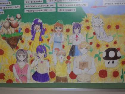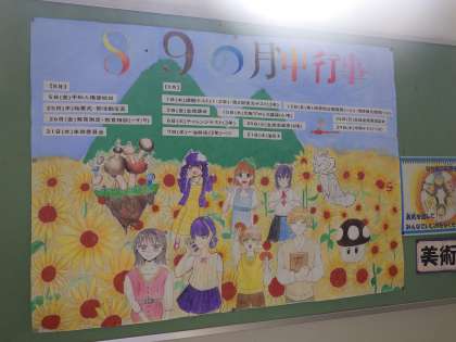 8月2日(火)暑い暑い8月を迎えました。階段踊り場の掲示板に8月・9月の行事予定が貼りだされています。美術部のみなさんが作ってくれました。ありがとう。