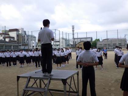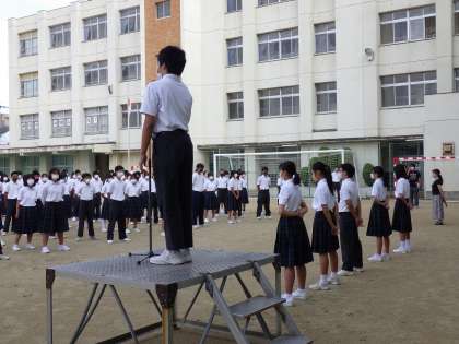 8月26日(金)臨時の全校集会を行いました。生徒会選挙管理委員会から生徒会役員選挙告示についてのお話がありました。