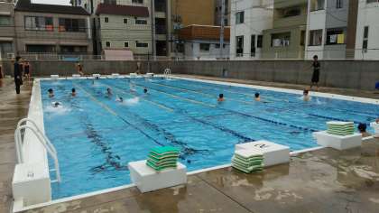 水泳の授業のようすです。先週より、水泳の授業が始まりました。授業中は3人態勢で行ない、事故防止に努めております。また、万が一に備えてAEDをプール再度に用意しております。
