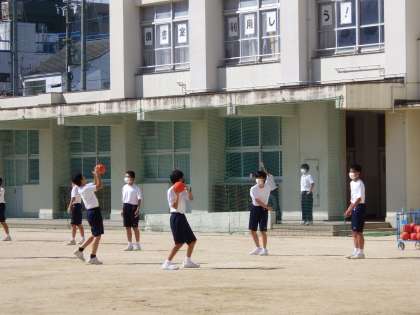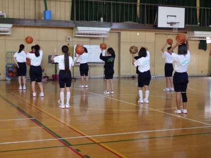 9月26日(月)1年生の体育、男子は運動場でハンドボール、女子は体育館でバスケットボールです。頑張っています。