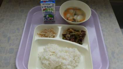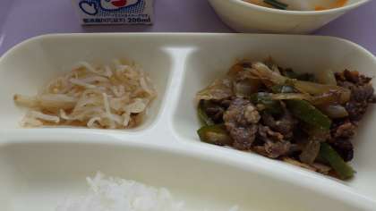 9月27日(火)の給食はプルコギ、トック、もやしの甘酢和え、ご飯、牛乳です。プルコギは牛肉、たまねぎ、ピーマン、しょうが、にんにくが入っています。トックはトック、にんじん、にら、しいたけが入った中華スープです。もやしの甘酢和えはブラックマッペもやしを薄口しょうゆ、砂糖、塩、米酢であっさり仕上げています。おいしかったです。ごちそうさまでした。