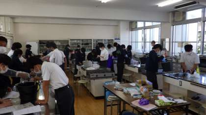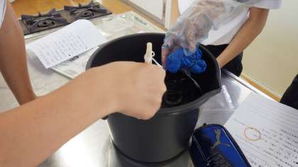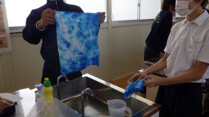 10月14日(金)2年生の美術「染色にチャレンジ」。布に色とりどりの色を染めていっています。