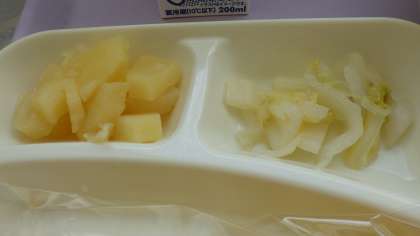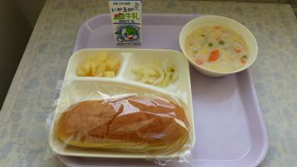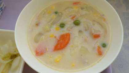 10月21日(金)の給食は豆乳コーンシチュー、白菜のピクルス、パインアップル缶、パン、牛乳です。豆乳モーンクリームシチューは鶏肉、ワイン、ベーコン、じゃがいも、たまねぎ、スイートコーン、にんじん、コーン、グリンピースに豆乳チキンブイオンで味付けしています。白菜のピクルスは白菜にワインビネガー、薄口しょうゆ、さとう、塩などであっさりです。おいしかったです。ごちそうさまでした。