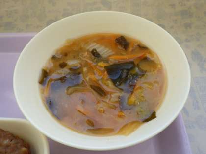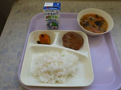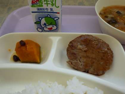 10月26日(水)の給食は和風ハンバーグ、みそ汁、かぼちゃのいとこ煮、ごはん、牛乳です。和風ハンバーグは砂糖、しょうゆで、みりんで味付けしています。みそ汁はとうふ、たまねぎ、はくさい、にんじん、わかめが入っています。おいしかったです。ごちそうさまでした。