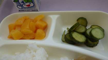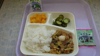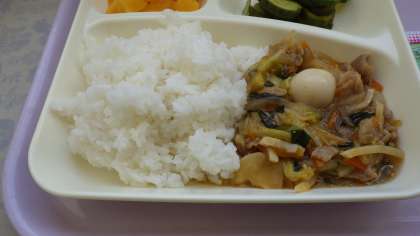 11月16日(水)の給食は中華丼、きゅうりのピリ辛和え、ソフト黒豆、黄桃、牛乳です。中華丼は豚肉、うずら卵、はくさい、たまねぎ、たけのこ、にんじん、にら、じょうが、しいたけが入っています。きゅうりのピリ辛和えはは砂糖、しょうゆ、米酢にラー油で味付けしています。おいしかったです。ごちそうさまでした。