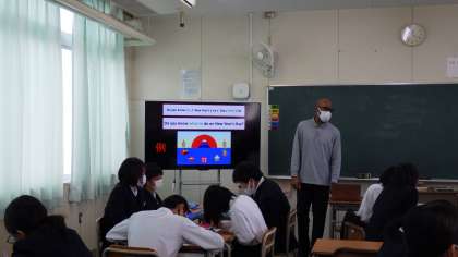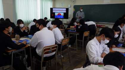 11月21日(月)2年生の英語の授業です。C-NETの先生の授業です。期末テスト前、頑張ってます。