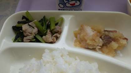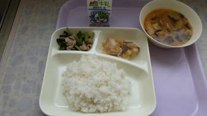 11月21日(月)の給食は鶏肉のおろしじょうゆかけ、みそ汁、小松菜の炒め物、ごはん、牛乳です。鶏肉のおろしじょうゆかけは鶏肉に大根おろしを添えみりんや薄口醤油で味付けしています。みそ汁はうすあげ、たまねぎ、はくさい、にんじん、わかめが入っています。こまつなのいためものは豚肉、小松菜を炒めています。おいしかったです。ごちそうさまでした。