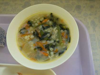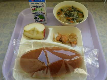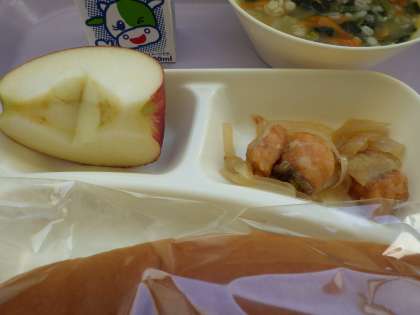 12月2日(金)の給食はサケのマリネ、肉団子と麦のスープ、リンゴ、パン、牛乳です。サケのマリネは油で揚げたサケを玉ねぎを入れています。肉団子と麦のスープは肉団子、押麦、だいこん、にんじん、ほうれんそうが入っています。おいしかったです。ごちそうさまでした。