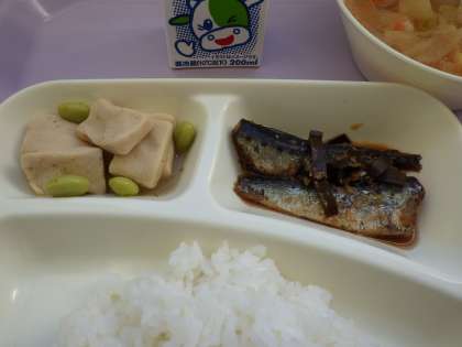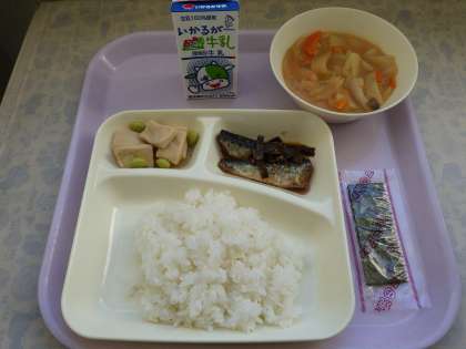 12月6日(火)の給食はいわしの生姜煮、みそ汁、高野豆腐の煮物、焼き海苔、ご飯、牛乳です。いわしの生姜煮はいわしを甘辛く煮こんでいます。骨も一緒に食べるることができます。高野豆腐の煮物は高野豆腐、むきえだまめ、が入っています。おいしかったです。ごちそうさまでした。