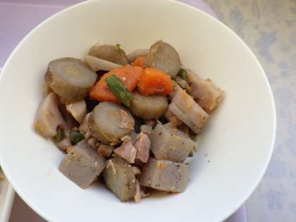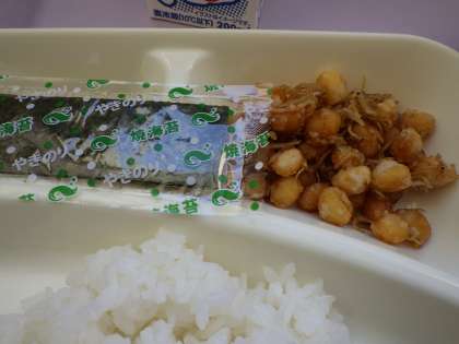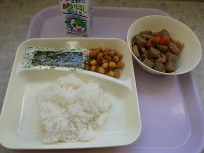 1月11日(水)の給食は筑前煮、じゃこ豆、焼き海苔、ご飯、牛乳です。筑前煮は鶏肉、こんにゃく、れんこん、ごぼう、にんじん、さんどまめ、しいたけが入っています。じゃこ豆は乾燥大豆を菜種油で揚げて砂糖や醤油で味付けしています。おいしかったです。ごちそうさまでした。