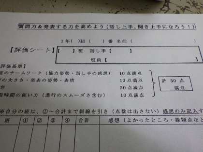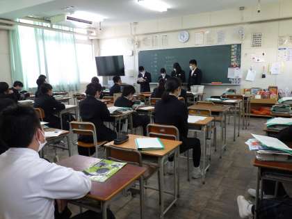 月17日(火)1年生の国語の様子です。質問力と発表する力を高めるための授業、各班が発表しています。