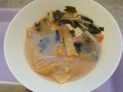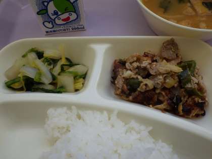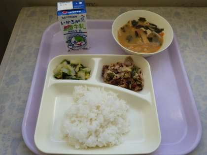 1月17日(火)の給食は豚肉のごまだれ焼き、みそ汁、菊菜と白菜のおひたし、ご飯、牛乳です。豚肉のごまだれ焼きは豚肉、たまねぎ、ピーマンを炒めねりごま、砂糖、みりん、しょうゆで味付けしています。みそ汁はうす揚げ、だいこん、にんじん、えのきたけ、わかめが入っています。菊菜と白菜のおひたしは砂糖と薄口醤油で味付けしています。おいしかったです。ごちそうさまでした。
