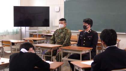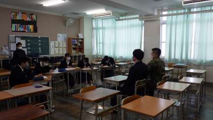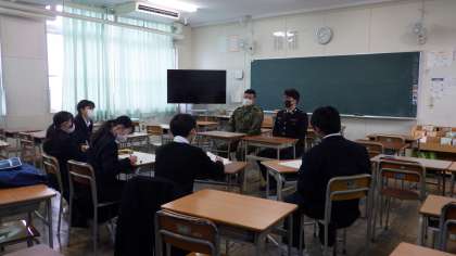 2月2日(木)1年生は職業インタビューを行いました。班に分かれ決められた事業所を訪問し仕事についてのインタビューを行いました。写真は学校に来ていただいた自衛隊方の話を聞いています。