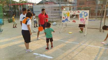 8月1日、橘小学校で「橘おたのしみ会」が開催されました。例年、PTAが「フリスビー投げ」のブースを開いていますが、今年は、生徒会生徒6名がお手伝いとして参加しました。小さな子どもたちを相手に、中学生のお兄ちゃん、お姉ちゃんとして活躍してくれました。地域の取組への中学生の参加とあって、区役所からのインタビューもありました。