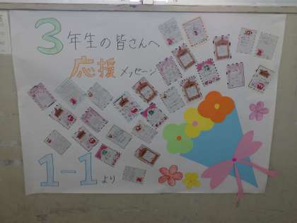 2月9日(木)いよいよ明日は3年生の私立高校の入学試験です。3年生の教室前の廊下に応援メッセージが掲示されています。