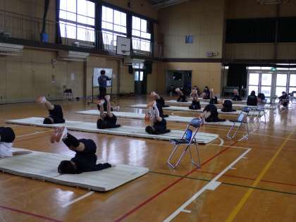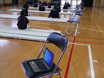 2月13日(月)1年生女子体育マット運動、パソコンを活用して動きの確認を行います。