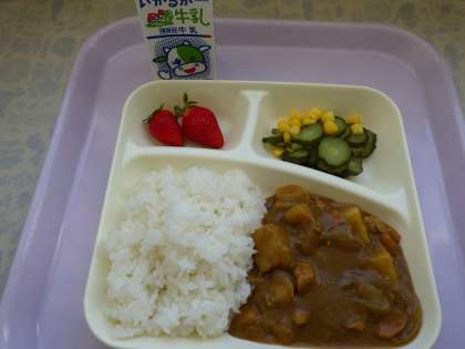 2月22日(水)の給食はチキンレバーカレー、きゅうりとコーンのサラダ、いちご、牛乳です。チキンレバーカレーは鶏肉、鶏レバー、じゃがいも、たまねぎ、にんじん、セロリ、しょうが、にんにくが入っています。きゅうりとコーンのサラダはきゅうりとコーンをワインビネガーや薄口醤油で味付けしています。おいしかったです。ごちそうさまでした。