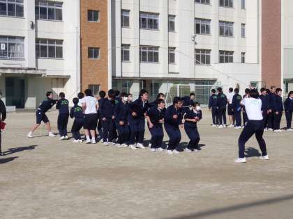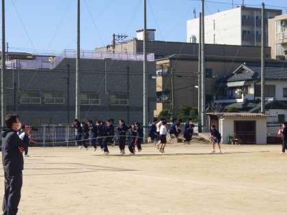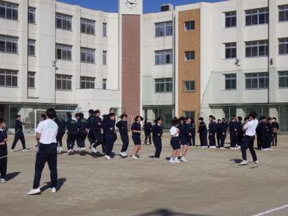 2月28日(火)暖かい日差しのもと3年生は「公立受験組応援企画球技大会」を行いました。運動場での大縄跳びの様子です。青空が広がっています。