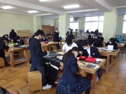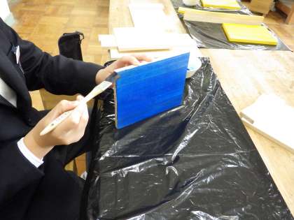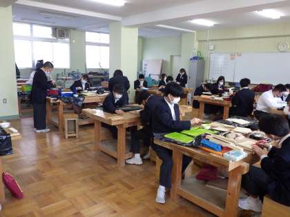 3月1日(水)1年生の美術の様子です。本立てを作っています。彫刻、色塗りは美術の授業で、切断、組み立ては技術の授業で行っています。