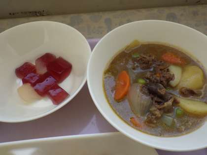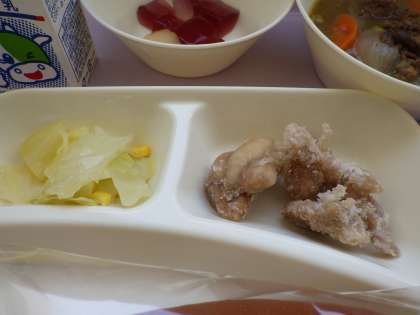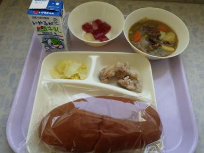 3月1日(水)の給食はフライドチキン、カレーシチュー、キャベツとコーンのサラダ、フルーツゼリー、パン、牛乳です。フライドチキンはカラッと揚げっておいしかったです。カレーシチューは牛肉、じゃがいも、たまねぎ、にんじん、グリンピース、にんにくが入っています。キャベツとコーンのサラダはキャベツとコーンにワインビネガーや醤油であっさり味に仕上げています。おいしかったです。ごちそうさまでした。
