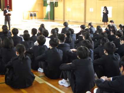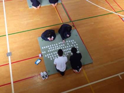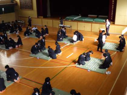 3月3日(金)の5・6時限に2年生が体育館で百人一首大会を開催しました。2回対戦をした後、坊主めくりなども行いました。クラス対抗の団体戦で、どのクラスも優勝めざして真剣に、とり札に集中して1枚でも多くとろうという気迫が伝わってきて、大いに盛り上がりました。