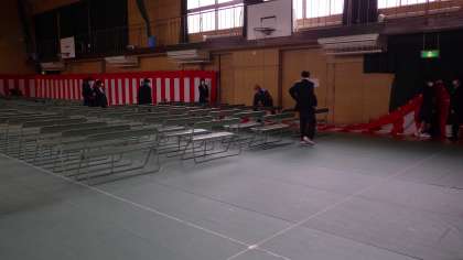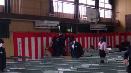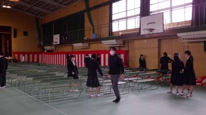 3月13日(月)明日の卒業式に向けて2年生は体育館で式場の準備をしています。