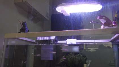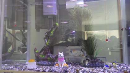 3月20日(月)管理作業員室の天下茶屋水族館で猫がのんびりとメダカを釣っています。釣れたかな?