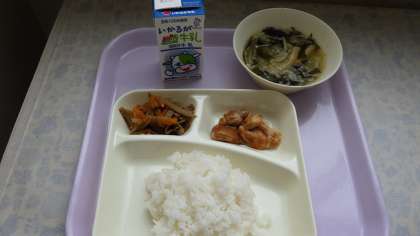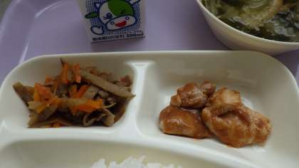 3月23日(木)令和4年度最後の給食は鶏肉のみそバターソース、五目汁、きんぴらごぼう、ご飯、牛乳です。鶏肉のみそバターソースは鶏肉に赤みそ、八丁味噌、バターで味付けしています。五目汁はうす揚げ、たまねぎ、キャベツ、えのきたけが入っています。きんぴらごぼうは豚肉、ごぼう、にんじんが入っています。おいしかったです。ごちそうさまでした。
