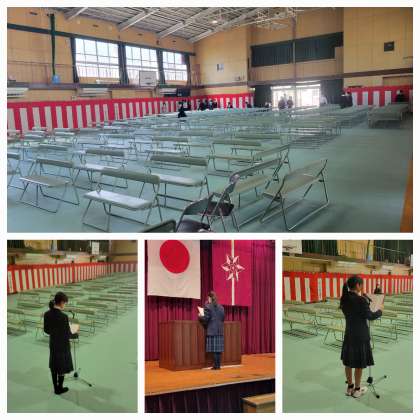 その後、新入生、在校生のあいさつの練習をしていました。明日、緊張しないようにつとめてください。よろしくお願いします。