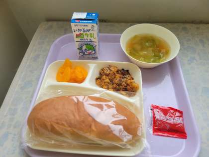 1年生の皆さん、小学校のときのパンの大きさと比べていかがですか?大きいなと感じた人も多いと思います。献立を考える栄養士さんたちは、皆さんの成長に合わせて、カロリー計算をしてくれています。今日も美味しくいただきましょう。