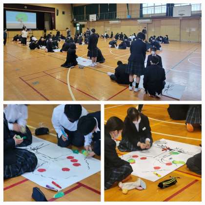 将来なりたい職業をリンゴに例えて、夢の実現のために必要なものを葉っぱや土の中の養分に置き換えて、班ごとに実のなる木を描いていきました。