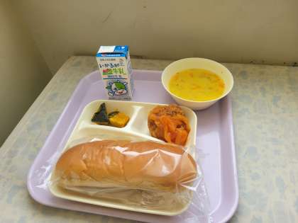 本日の給食は、煮込みハンバーグ、コーンとキャベツのスープ、焼きカボチャでした。